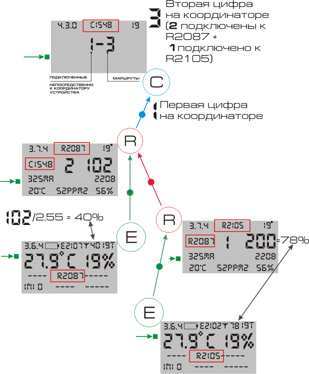 Беспроводная сеть работает по протоколу AnronAutomationProtocol (AAP) в стандарте IEEE 802.15.4 на частотах, близких к частотам Wi-Fi, но частоты каналов выбраны таким образом, чтобы попадать в промежутки между частотными каналами Wi-Fi. Сервер AAS через координатор C организует и поддерживает сеть, состоящую из конечных устройств (измерителей) Е и, если это необходимо, роутеров R. Сеть самоорганизуется в разные топологии, например, все измерители E могут быть подключены напрямую к координатору C или часть из них подключается к нему через роутеры R. Эти маршруты не прописаны жестко - сеть самоорганизуется, согласно стандарту IEEE 802.15.4. В прямой видимости измерители, оснащенные антенной, "видят" координатор с расстояния в 500-600 м, в условиях промышленной застройки или помещений это расстояние, конечно, существенно падает.